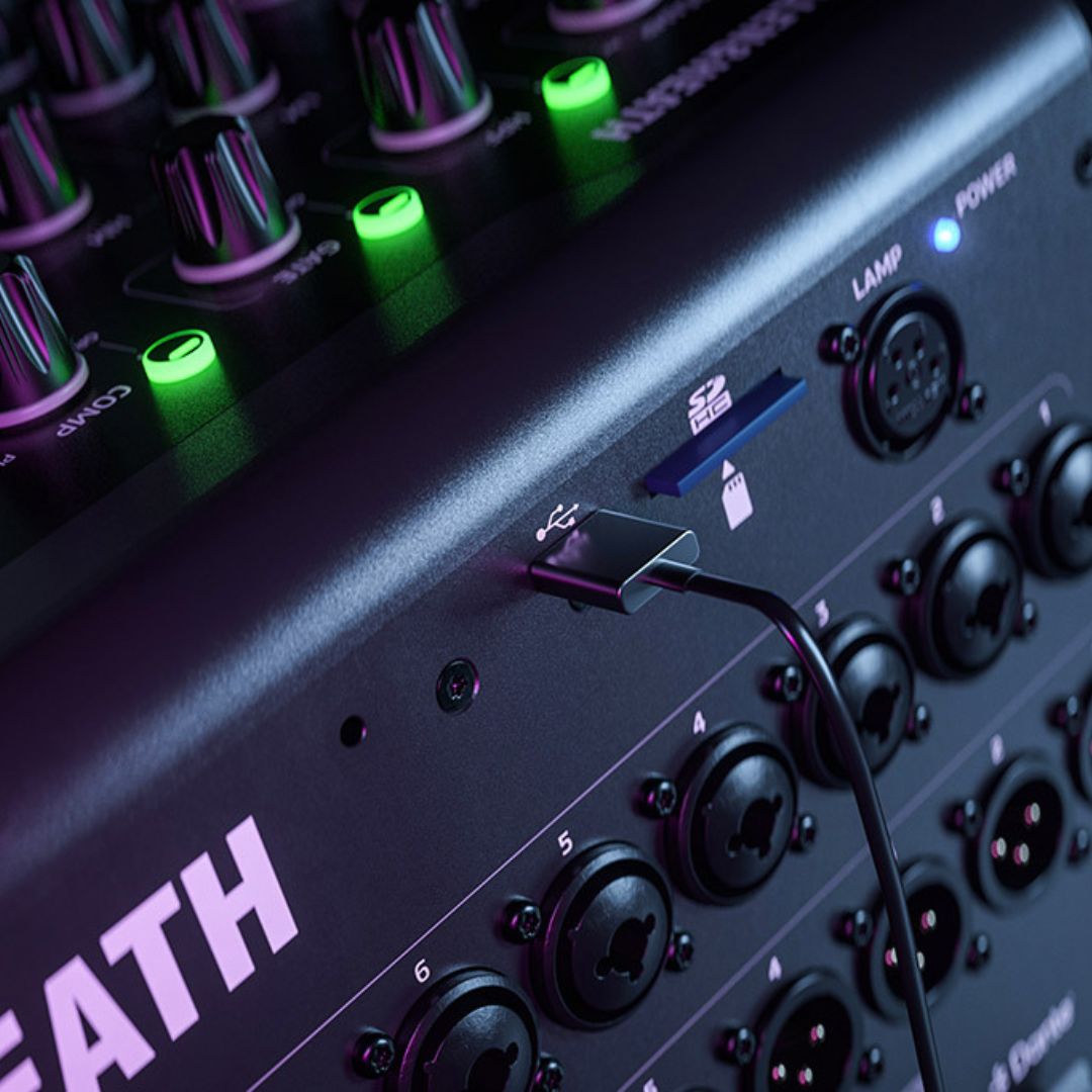 A built-in 16×16 Dante interface, 128×128 SLink expansion, and 32×32 USB-C/SD multitrack recording provide advanced connectivity for live, install, and production environments. The redesigned UI, 7″ touchscreen, 33 motorised faders, customizable layers, and expanded SoftKeys ensure fast, intuitive mixing for any workflow.