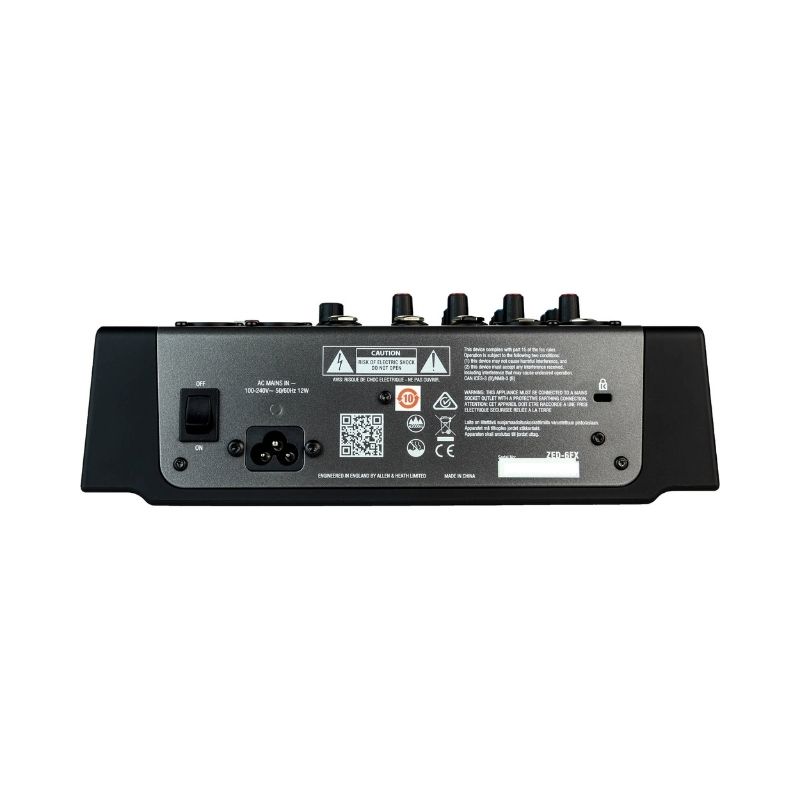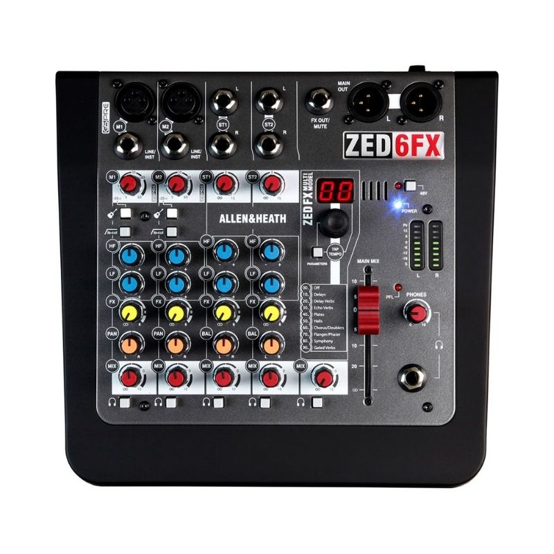 • The Allen & Heath ZED-6FX is a compact 6-input analog mixer designed for musicians, singer-songwriters, and small venues who want professional sound in a portable format. It features premium mic preamps from Allen & Heath’s touring range for low noise and rich audio depth. Two Hi-Z inputs let guitars connect directly without DI boxes, making setup simpler. A refined 2-band MusiQ EQ delivers musical tonal shaping perfect for live or studio use. With built-in effects, stereo line inputs, phantom power for condensers, and a rugged, lightweight build, the ZED-6FX is ideal for live sets, rehearsals, or mobile recording.