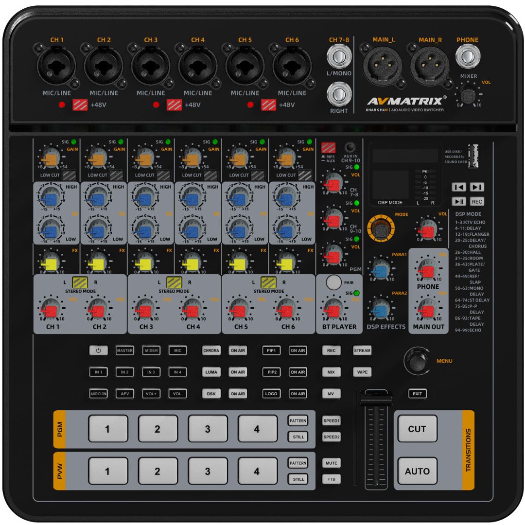 The AVMATRIX SHARK H4M is a compact all-in-one live production switcher combining 1080p60 video switching with powerful audio mixing for creators, educators, and event producers. It offers four HDMI inputs, dual program outputs, a multiview monitor, and direct UVC streaming via USB-C with LAN-based RTMP/SRT support. Real-time effects include chroma/luma keying, PiP/PoP layouts, transitions, DSK, and logo overlays, with recording to SD cards or USB drives. Audio features include six mic/line inputs, stereo inputs, XLR outputs, and headphone monitoring, enhanced by phantom power, low-cut filters, gain control, and 99 DSP effects. Additional tools like Bluetooth input, MP3 playback, and USB sound card functionality add flexibility. Lightweight and portable with tactile controls and web-based management, it delivers a complete multi-camera, multi-source production solution.