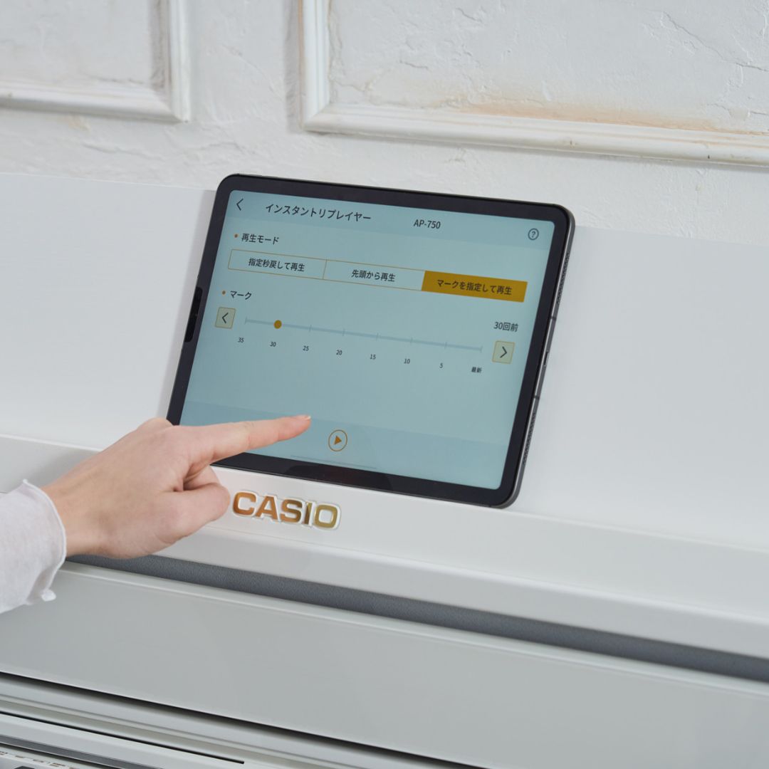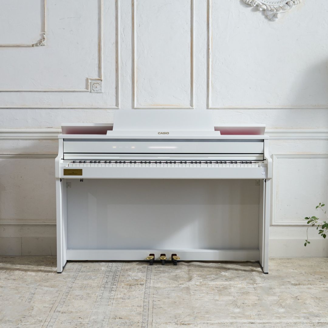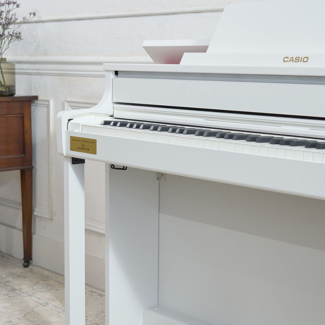 The three-pedal system supports continuous, nuanced control for expressive playing, including soft, sostenuto, and damper pedals. Instant RePlayer and Visual Information Bar allow recording, playback, and performance monitoring. Wireless MIDI and CASIO MUSIC SPACE app support enhance practice, recording, and modern connectivity.