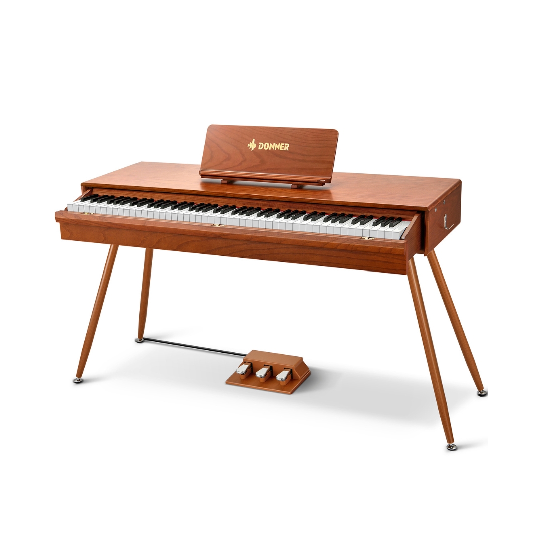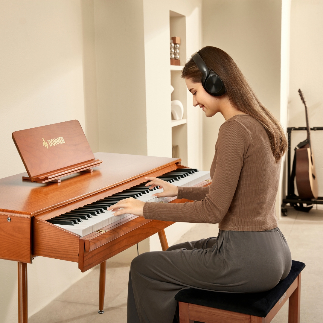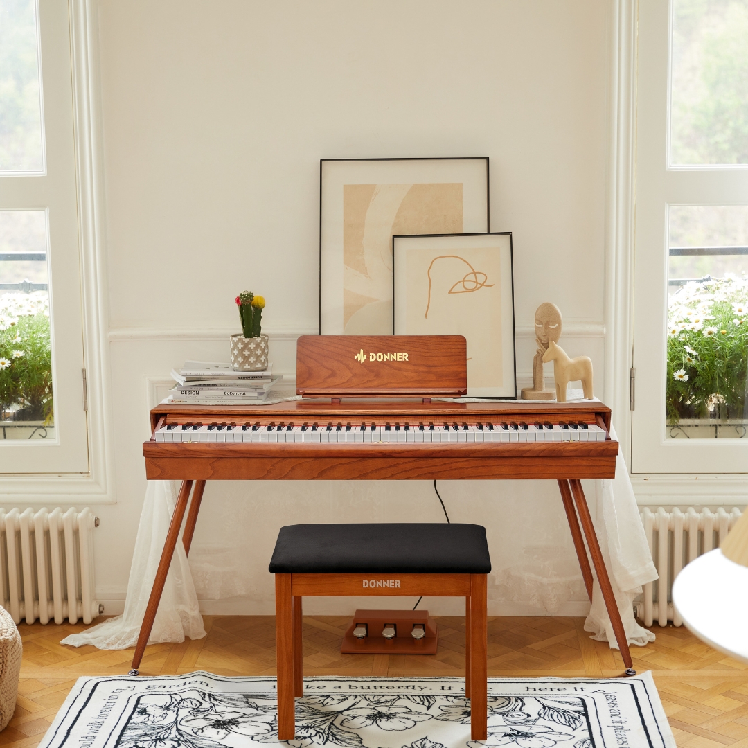 The Donner DDP-80 Pro digital piano offers style, functionality, and space-saving design, catering to both beginners and seasoned players. Its contemporary cabinet and compact size blend seamlessly with modern home decor. With versatile features including USB connectivity, audio accompaniment, and storage options, it’s not just an instrument but a decorative piece as well. The hammer action weighted keys provide a realistic playing experience, while advanced sound samples faithfully reproduce the tones of an acoustic piano. With headphone mode for silent practice, the DDP-80 Pro offers elegance, functionality, and superior sound quality for any musician.