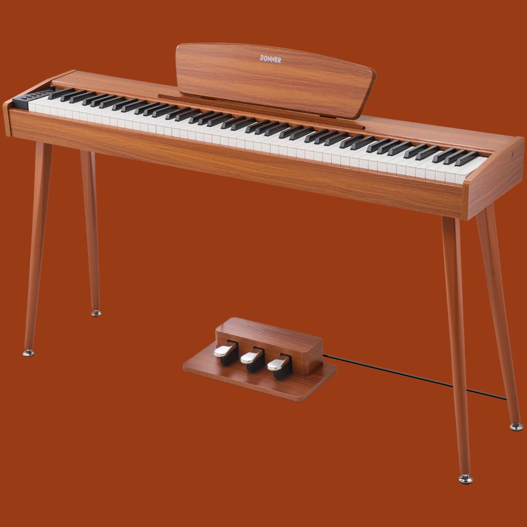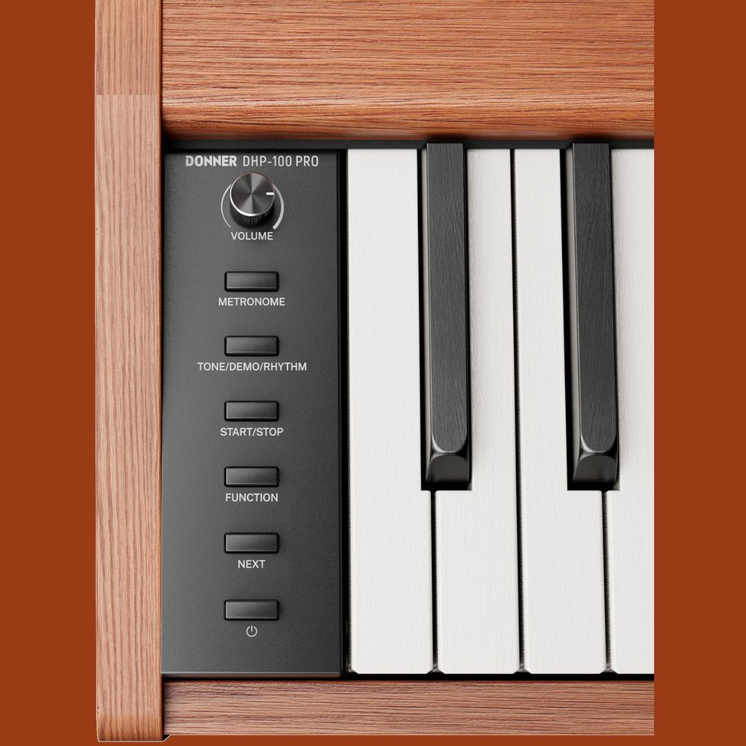The Donner DHP-100 Pro digital piano in wood finish is perfect for beginners, returning players, and home use. It features 88 touch-sensitive keys with four velocity curves and 128-note polyphony for expressive, dynamic playing. A built-in 2 × 15 W speaker system with 128 sounds, 83 rhythms, 47 demo songs, and 8 reverb effects offers versatile practice and performance options. Duet/Twin and Split modes, metronome, transpose, and recording functions support structured learning and collaborative play. USB-MIDI, three headphone jacks, sustain pedal input, and AUX/stereo output provide connectivity for apps, silent practice, and external amplification. Its slim, wood-look cabinet combines stability, elegance, and space-saving design for any home or teaching environment.
