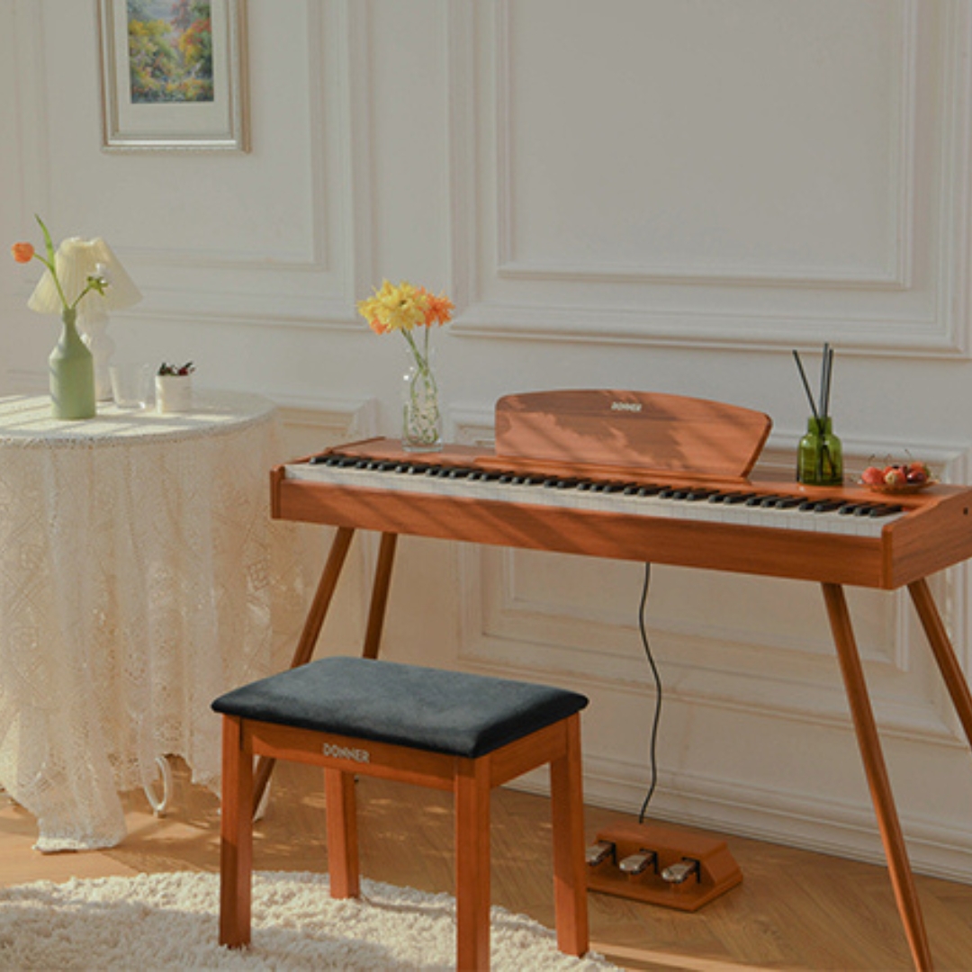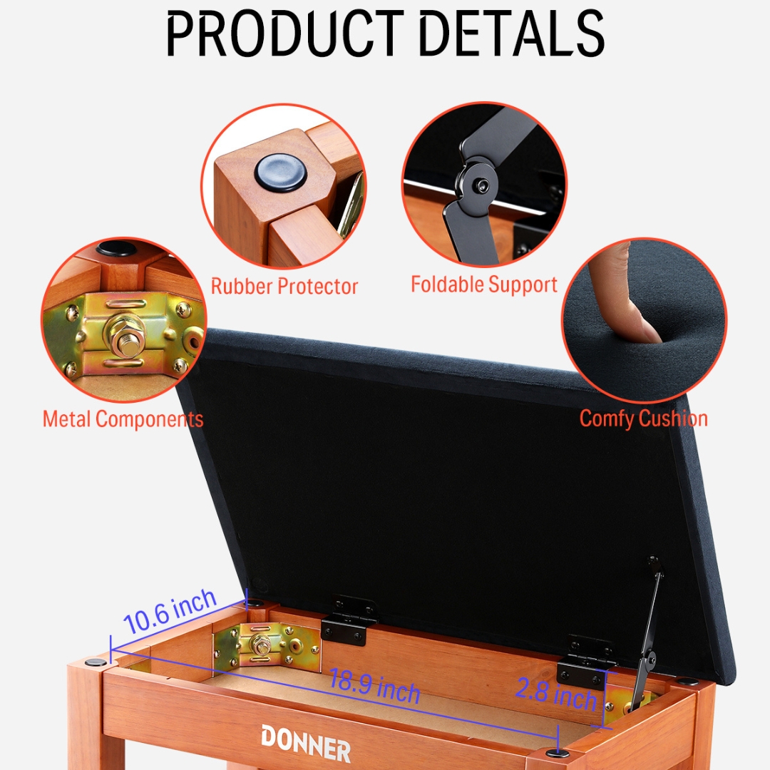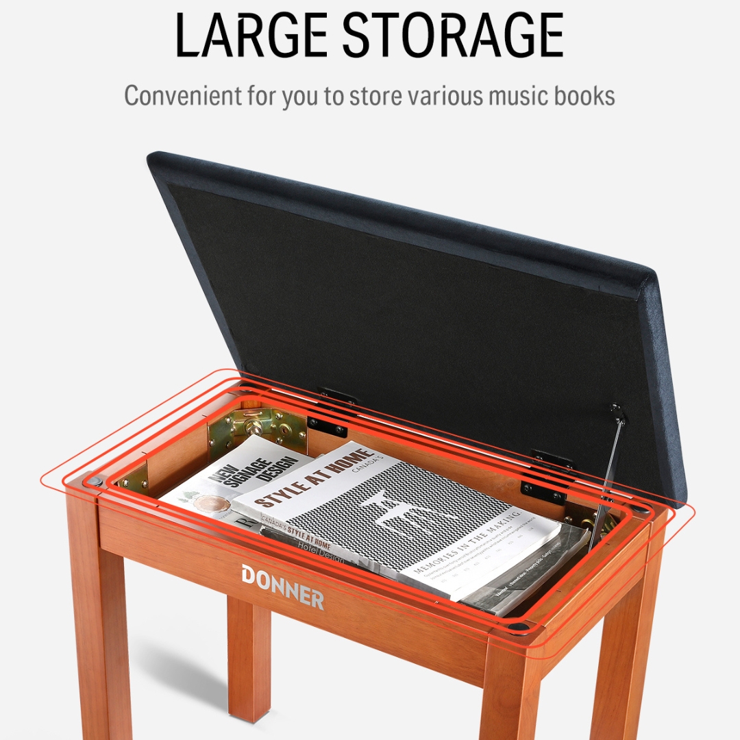 Different from the traditional piano stool, Donner bookcase piano bench which can store sheet music or other books, provides convenient hidden storage space for you. The flip-top is easy to open and with stable support.