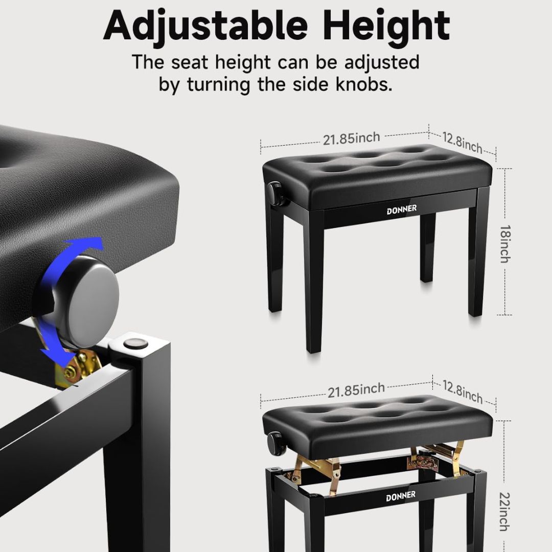 The Donner EC7024 Height-Adjustable Piano Bench – Black is a sturdy and comfortable seating solution designed for pianists of all ages. Crafted from solid wood with a reliable metal lifting mechanism, it offers long-term durability and stable support for daily practice or performance. The height-adjustable design allows precise positioning for proper posture, while the thick high-density foam cushion ensures comfort during extended playing sessions. Non-slip rubber foot pads enhance stability and protect floors, making this bench a practical and elegant companion for both digital and acoustic pianos.