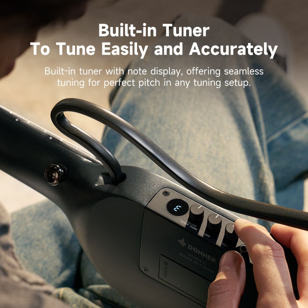 The Donner HUSH‑C Silent Electric Acoustic Guitar (Nylon) combines classical elegance with modern innovation, delivering exceptional playability, smooth natural tones, and ultimate portability. Its headless design, built-in tuner, and lightweight 2.5 kg frame make it perfect for home practice, travel, or outdoor performances. Equipped with a custom piezo pickup and DONNER HPS-II system, it captures every nuance of your playing. Durable mahogany and okoume construction with dual carbon fiber reinforcements ensures stable performance, while rounded frets and a satin finish provide comfortable, effortless play. Versatile outputs support silent practice, stage use, and external amplification, making the HUSH‑C ideal for players of all levels.