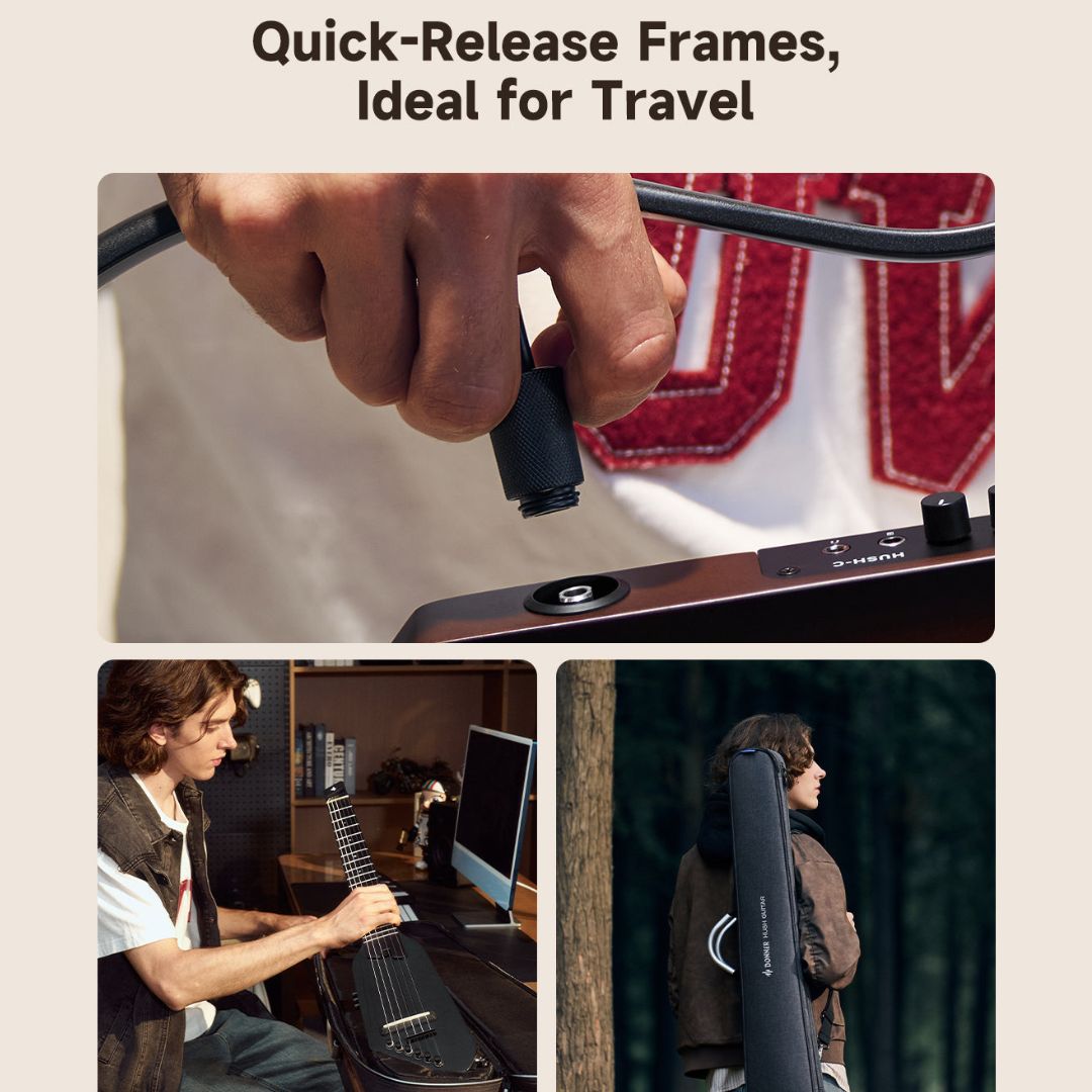 Weighing just 2.5 kg, the HUSH-C is half the weight of traditional guitars, making it ideal for travel, daily practice, and outdoor performances. Its headless design and quick-release stand enhance portability without sacrificing stability.