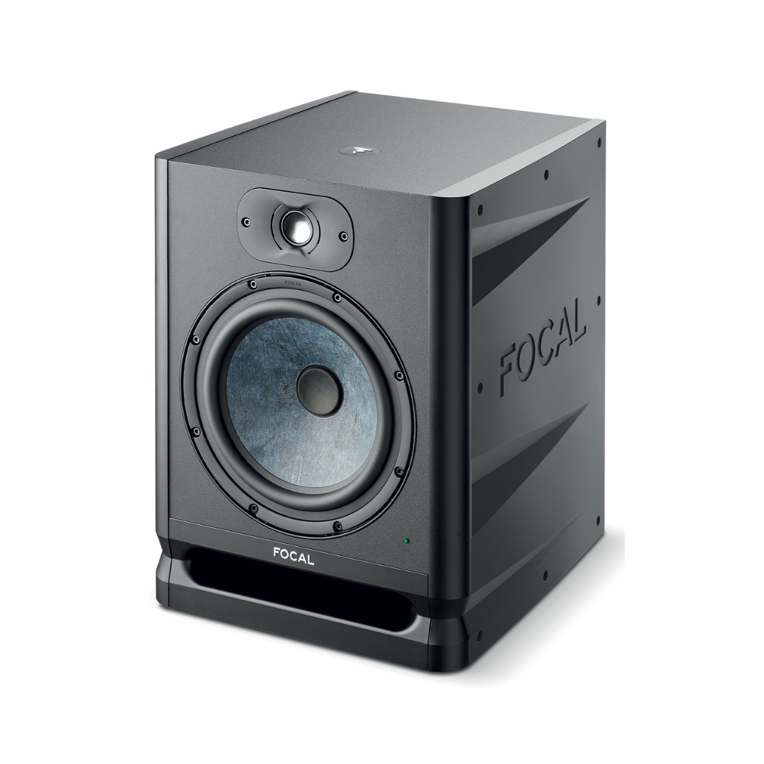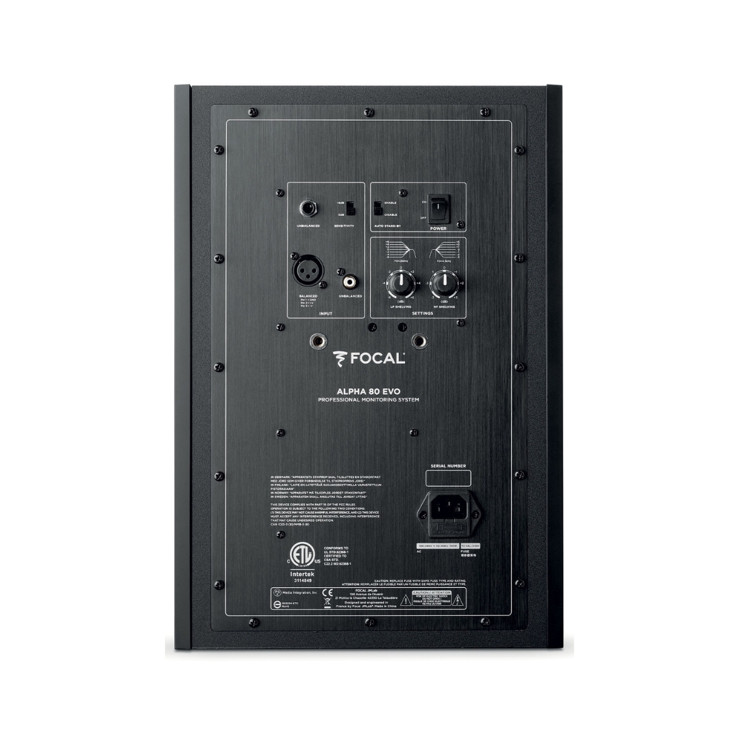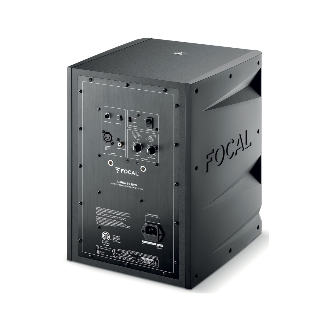 - The Focal Alpha 80 Evo is a professional nearfield speaker designed for accurate mixing, mastering, and playback. It features an 8-inch Slatefiber woofer and a 1-inch aluminum inverted dome tweeter for neutral, low-distortion sound, powered by dual Class-D amplifiers that deliver consistent performance across a 38 Hz to 22 kHz frequency range at both low and high volumes. It offers versatile connectivity via XLR, TRS, and RCA inputs, along with onboard EQ controls for bass (±6 dB) and treble (±3 dB) adjustment. A bass-reflex cabinet with a large laminar port enhances low-frequency response, while additional features include defeatable auto standby, sensitivity control, durable MDF construction with internal bracing, and wall-mount compatibility for flexible studio integration.