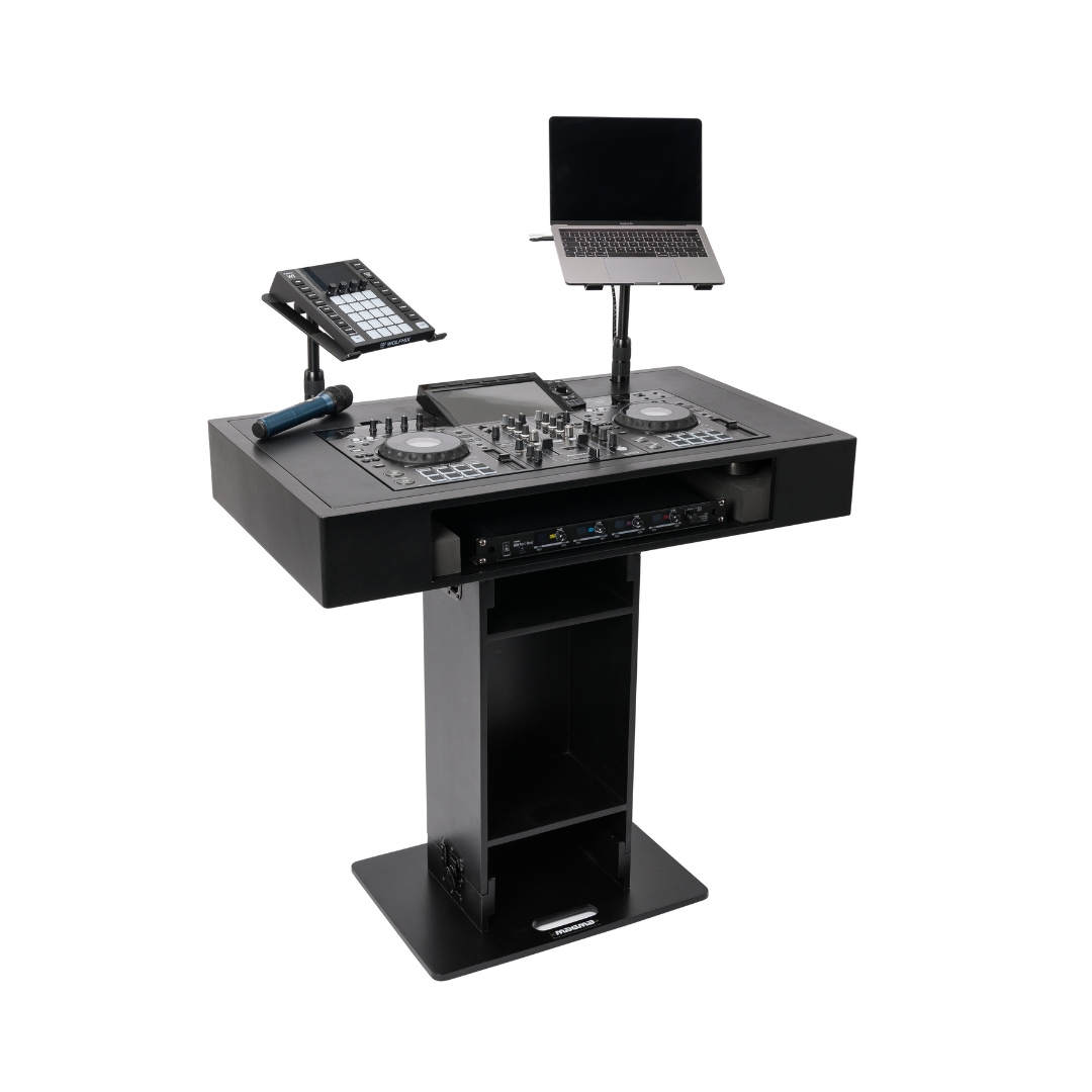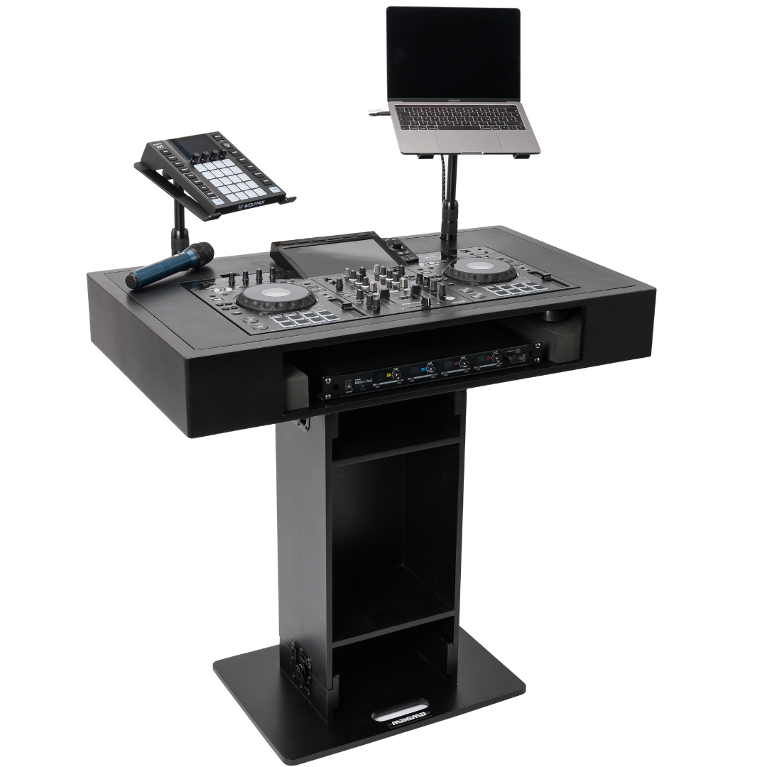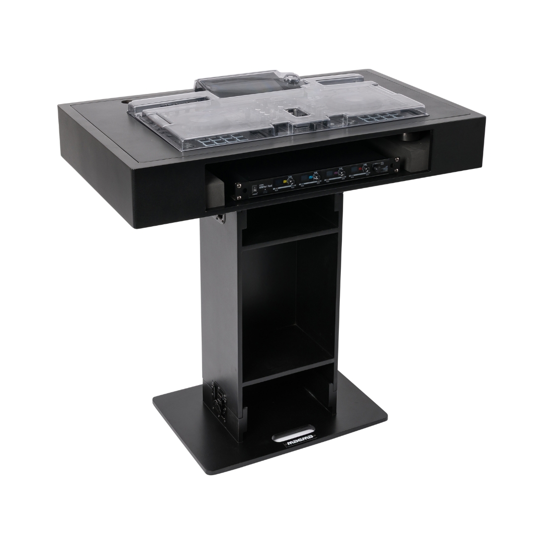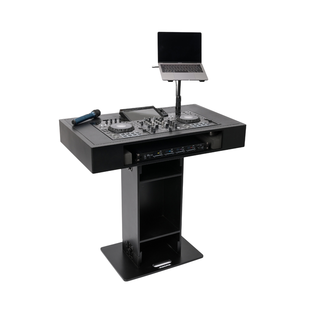 The Magma Groove Terminal XDJ-RX3 DJ Booth (Black) – 50002 offers a durable and stylish setup made from 15 mm plywood with a matte black finish, providing a clean, organized performance hub for mobile DJs, events, clubs, or studios.