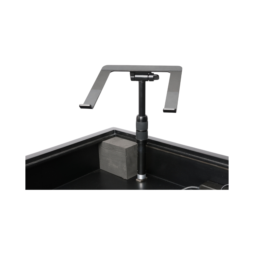 - Includes a fully adjustable Laptop-Stand (height, tilt, and rotation) with a 3/8“ screw thread, which can be mounted on the left or right side
