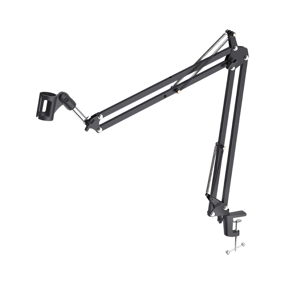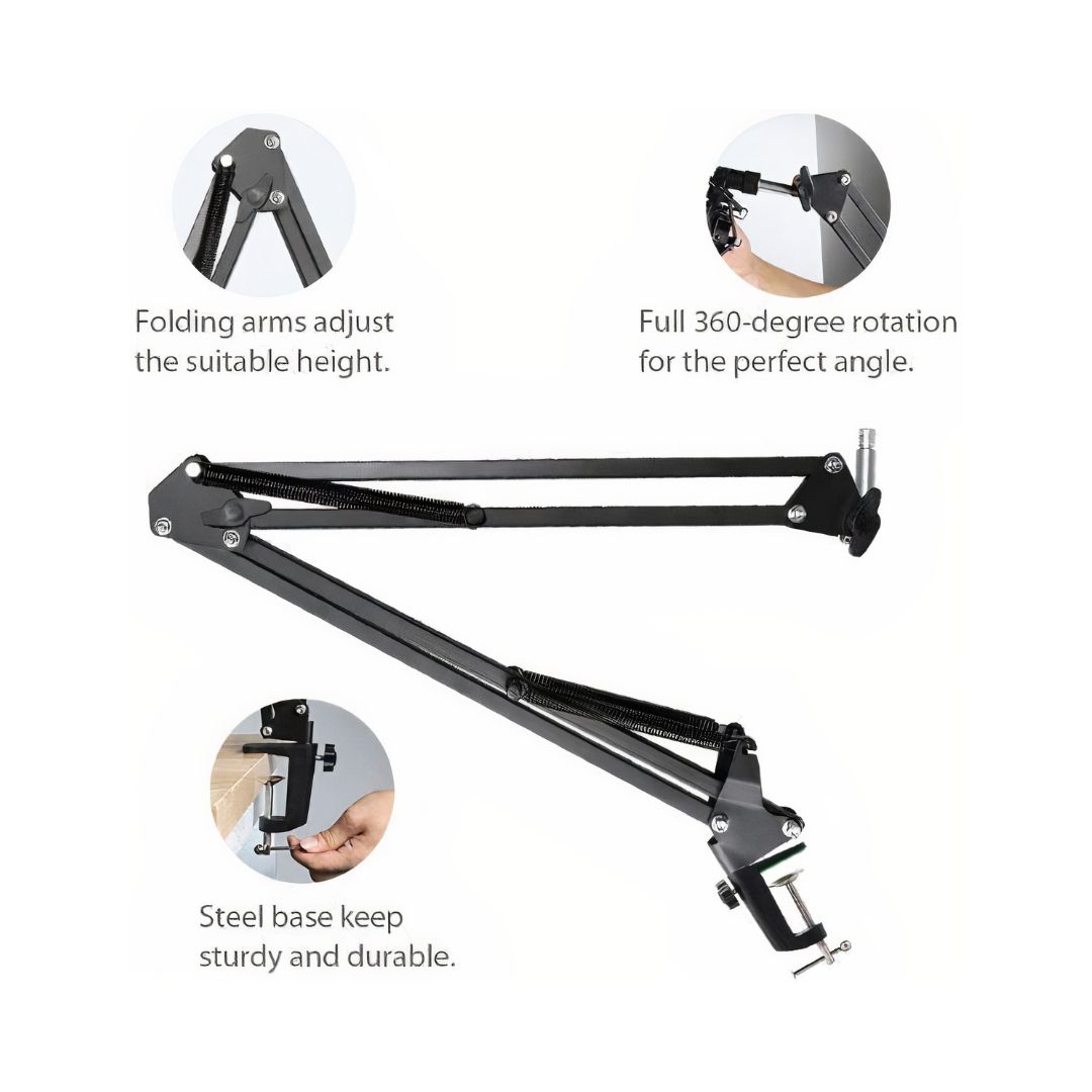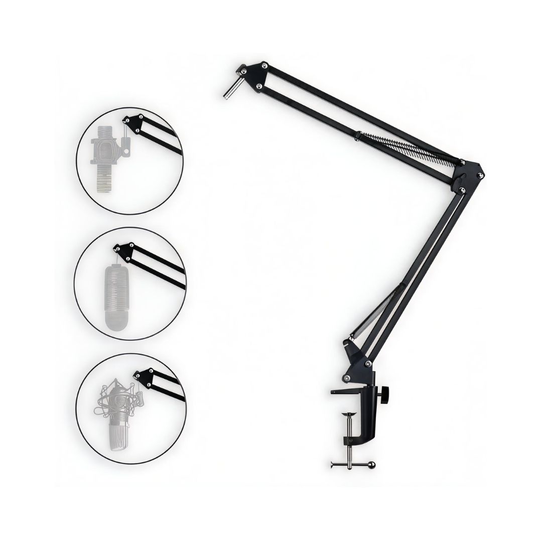 - Professional kit includes microphone scissor arm stand, desk mounting clamp and microphone clip