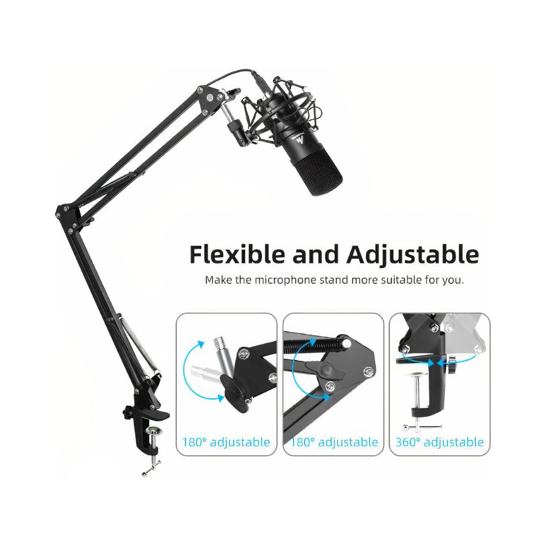 The Maono BA20 Microphone Suspension Boom Scissor Arm Stand, made from premium steel, offers durability and reliability. With dual suspension springs for mic protection, it’s versatile, easily mounting to various surfaces. Adjustable positioning and a professional kit make it ideal for any recording setup.