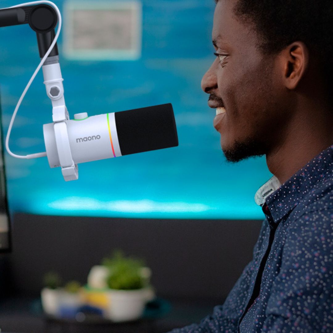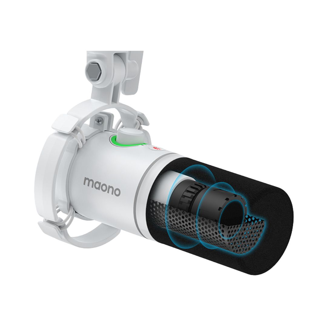 The MAONO PD200X USB/XLR Dynamic Microphone is a versatile broadcast-style microphone designed for podcasting, streaming, gaming, recording, and online communication. Its cardioid polar pattern focuses on your voice while reducing background noise for clear, professional results. Dual USB-C and XLR connectivity allows easy plug-and-play use with computers and smartphones or professional connection to audio interfaces and mixers. Delivering 24-bit/48kHz audio with a 40Hz–16kHz frequency response, it captures detailed and natural sound. The microphone features a 2-in-1 smart knob, one-click mute, real-time headphone monitoring, and customizable RGB lighting. With MAONO Link software offering EQ, compressor, and limiter control, the PD200X provides flexible sound shaping for creators of all levels.