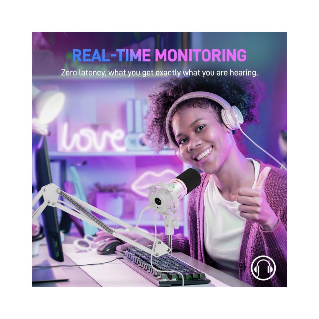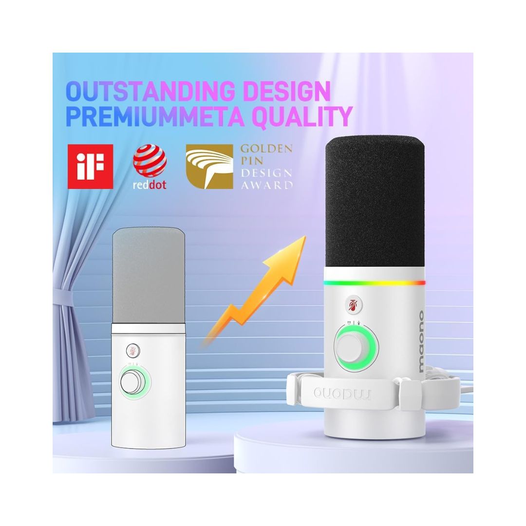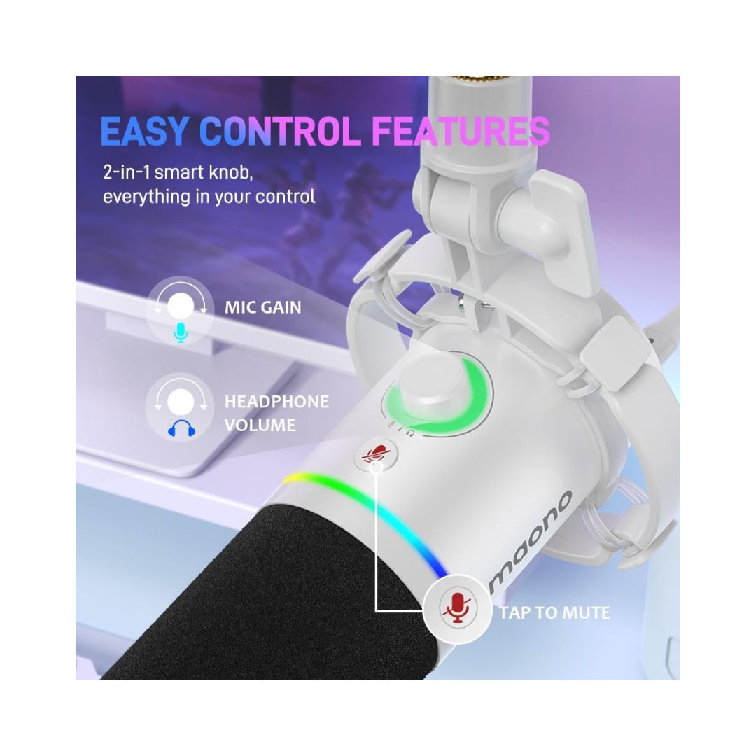 Features a 2-in-1 knob for mic gain and headphone volume, one-touch mute, real-time monitoring, and MAONO Link software for EQ, compressor, and limiter adjustments, giving creators full control over their audio output.