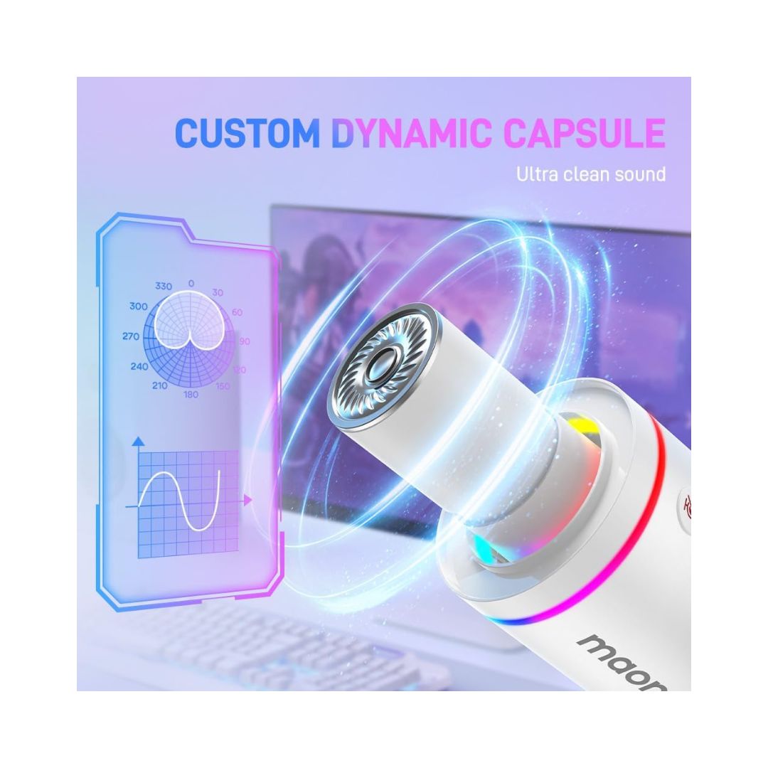The dynamic capsule with a cardioid polar pattern focuses on sound from the front while reducing background noise from the sides and rear, ensuring clear, professional vocals ideal for podcasting, streaming, gaming, and recording.
