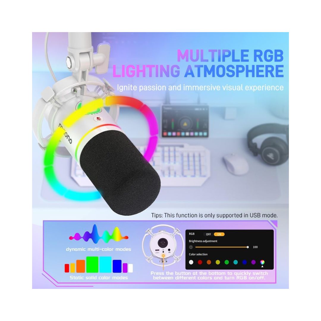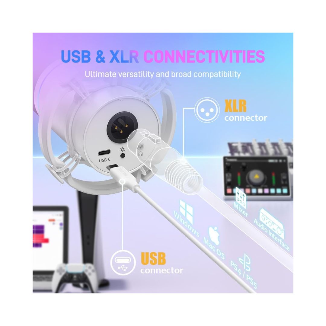 Dual USB-C and XLR connections allow plug-and-play use with computers and mobile devices, while also enabling integration with mixers, audio interfaces, and professional recording equipment for versatile setup options.