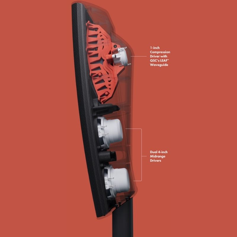 - 3-way loudspeaker system featuring a 12-inch (305 mm) subwoofer, two high-excursion 4-inch (102 mm) midrange drivers and a 1-inch (25.4 mm) HF compression driver combined with the proprietary QSC LEAF™ waveguide.