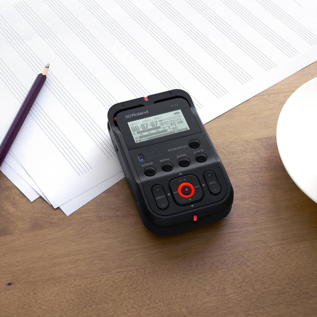 The Roland R-07 is a sleek, pocket-sized recorder offering high-resolution audio up to 24-bit/96kHz. It features built-in stereo microphones and supports both WAV and MP3 formats. Bluetooth connectivity allows for remote control and wireless monitoring via smartphones or smartwatches. With Dual Recording and Hybrid Limiting, it ensures reliable captures without clipping. The one-touch Scene function optimizes settings for various recording scenarios. Powered by two AA batteries or USB, the R-07 is ideal for musicians, journalists, and field recordists.